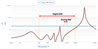 使用多個去耦電容器將PDN上的數(shù)字和模擬信號帶寬進行比較的示例